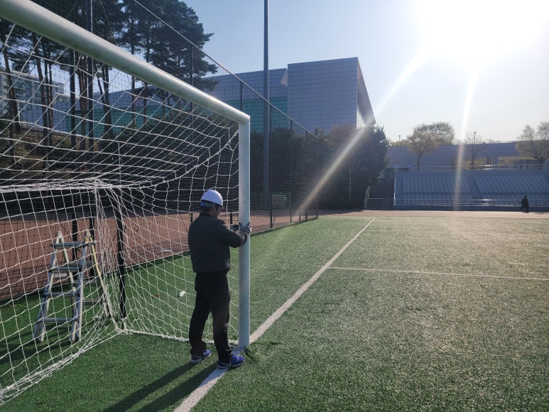 축구골대에서 골망은 잦은 사용과 날씨의 영향으로 시간이 지나면서 마모되고 손상될 수 있습니다. 이때 적절한 시기에 골망을 교체하는 것은 필수적인 유지 보수 작업입니다. 이번 블로그에서는 축구골망을 효율적으로 교체하는 방법과 주의할 점에 대해 알아보겠습니다. 축구골망 종류에도 경기용, 국제경기용, 일반용 등이 있으며 이는 축구골망의 재질, 굵기 등이 다를 수 있습니다. 고양별무리경기장에 경기용 축구골망 교체 작업을 진행하였습니다.