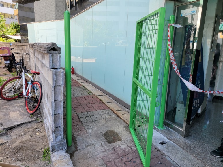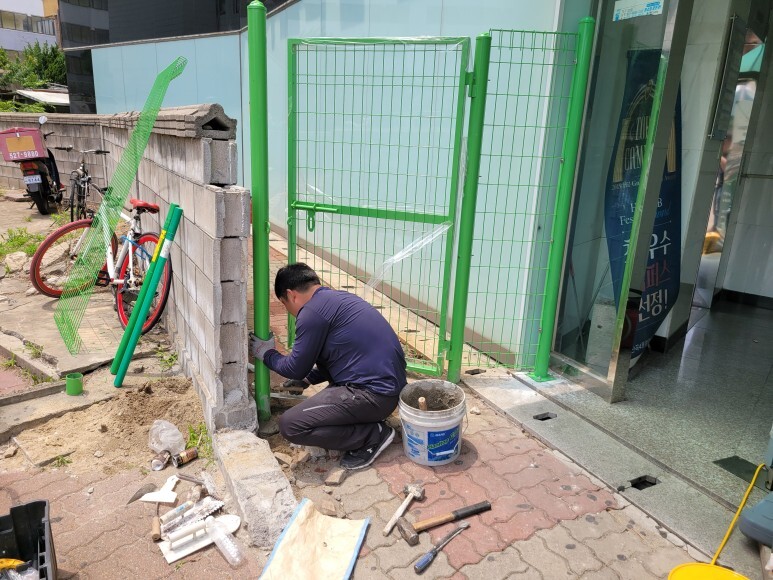 작업 방법: 기초형 메쉬휀스를 설치하기 위해 바닥 보도블럭을 제거하고 대략 300~400mm정도 심어서 몰탈을 이용하여 고정 작업을 진행합니다. 대리석은 앙카형 기둥을 통해 앙카 설치 및 고정 작업을 진행합니다. 메쉬휀스 도어 및 메쉬휀스 판을 설치를 통해 이동통로를 제어합니다. 계단 핸드레일 파손 부분은 알곤 용접을 통해서 흔들림 없이 용접 작업을 진행, 방화문 피벗힌지 파손 부위도 제거 후 새로운 피벗 힌지 용접 작업을 진행하면 작업이 완료됩니다.